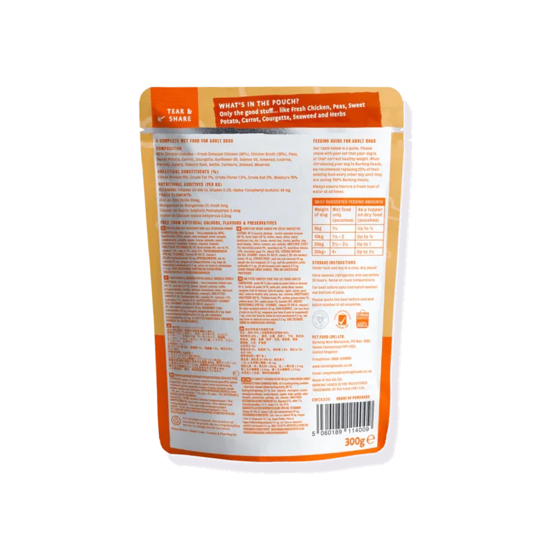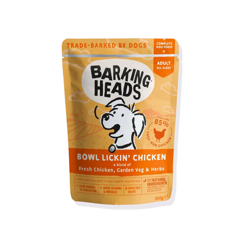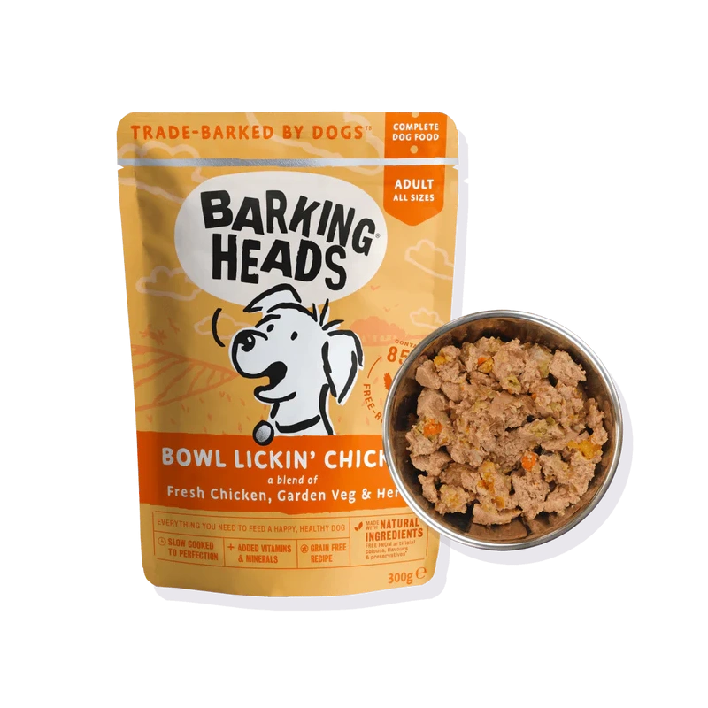 Barking Heads Bowl Lickin’ Chicken Wet on maitsev, teraviljavaba ja tasakaalustatud märgtoit täiskasvanud koertele. See on aeglaselt küpsetatud kvaliteetsest vabalt kasvatatud kanast koos värskete aiaviljade ja ürtidega, et pakkuda rikkalikku maitset ning toetada sinu koera immuunsüsteemi, seedimist ja üldist heaolu. Toit ei sisalda kunstlikke värv-, maitse- ega säilitusaineid ning sobib hästi nii täistoiduks kui kuivtoidu lisandiks.