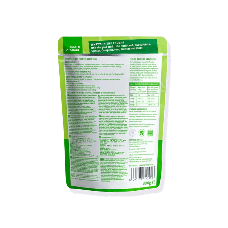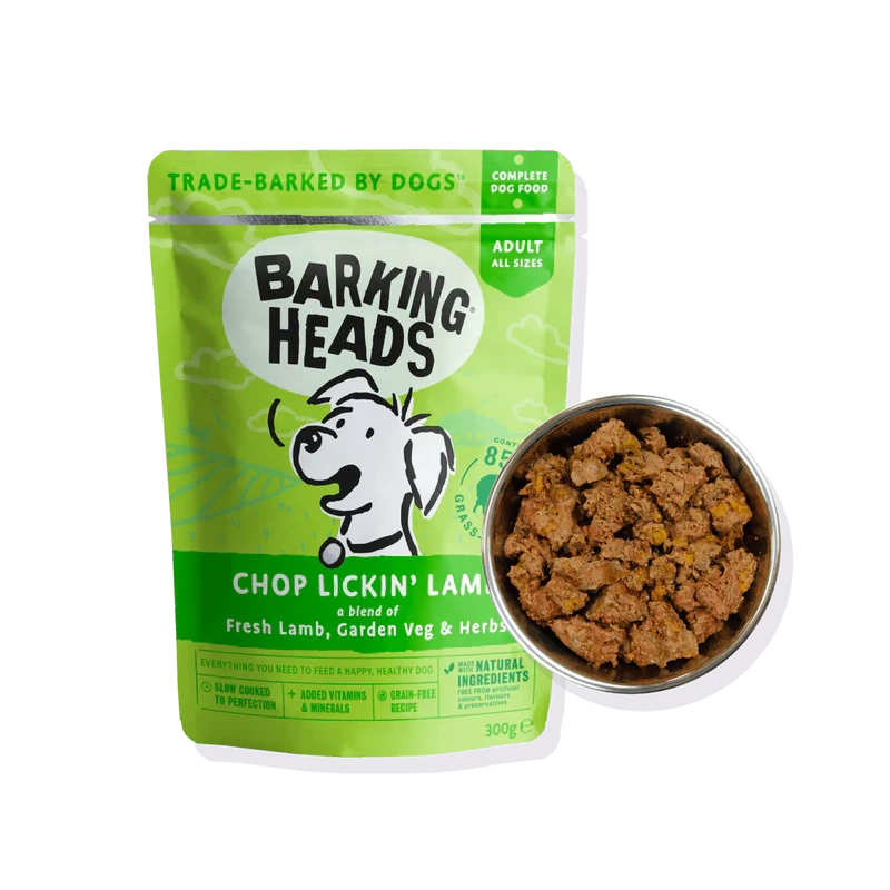Barking Heads Chop Lickin’ Lamb Wet on maitsev ja looduslikult tasakaalustatud märgtoit täiskasvanud koertele. Teraviljavaba retsept sisaldab kuni 85% värskest lambalihast, mis on aeglaselt küpsetatud koos aiaviljade, aedviljade ja ürtidega, et säilitada toitained ja rikkalik maitse. Toit on rikastatud vitamiinide ja mineraalainetega ning ei sisalda kunstlikke värv- ega säilitusaineid — sobib ideaalselt igapäevaseks toiduks või kuivtoidu täienduseks.