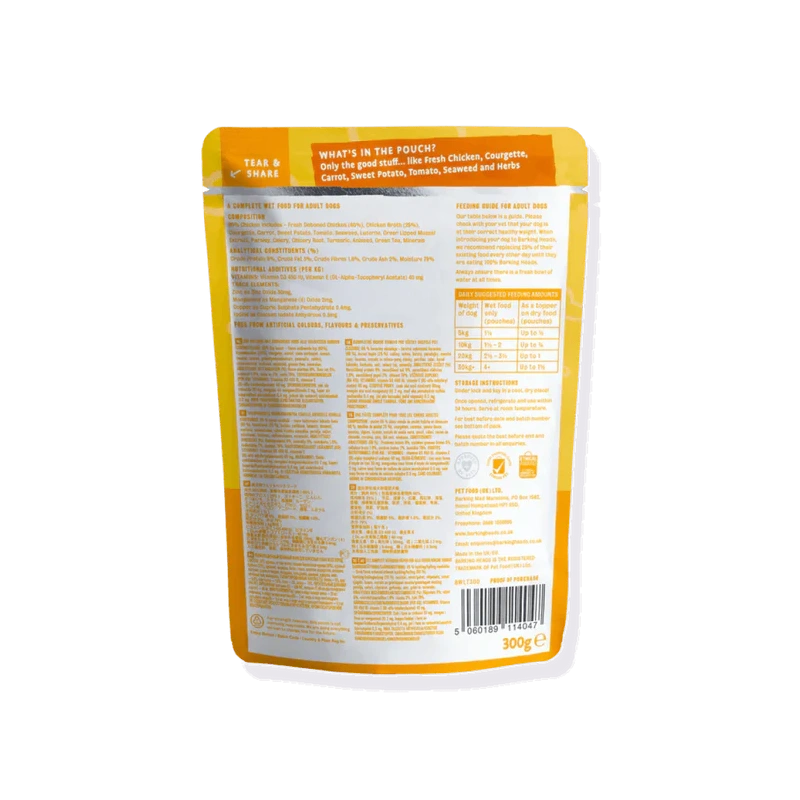 Barking Heads Fat Dog Slim Wet on maitsev ja tasakaalustatud märgtoit, mis on spetsiaalselt formuleeritud koertele, kes jälgivad kaalu. See retsept sisaldab 85 % vabapidamisel kasvatatud kanaliha, koos vitamiinide, mineraalide ja looduslike köögiviljadega, et pakkuda täielikku ja tervislikku toitumist madalama rasvasisaldusega. Retsept on teraviljavaba, ei sisalda kunstlikke värvi- ega säilitusaineid ning toetab liigesete tervist ja seedimist.