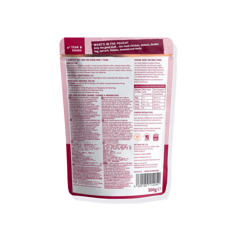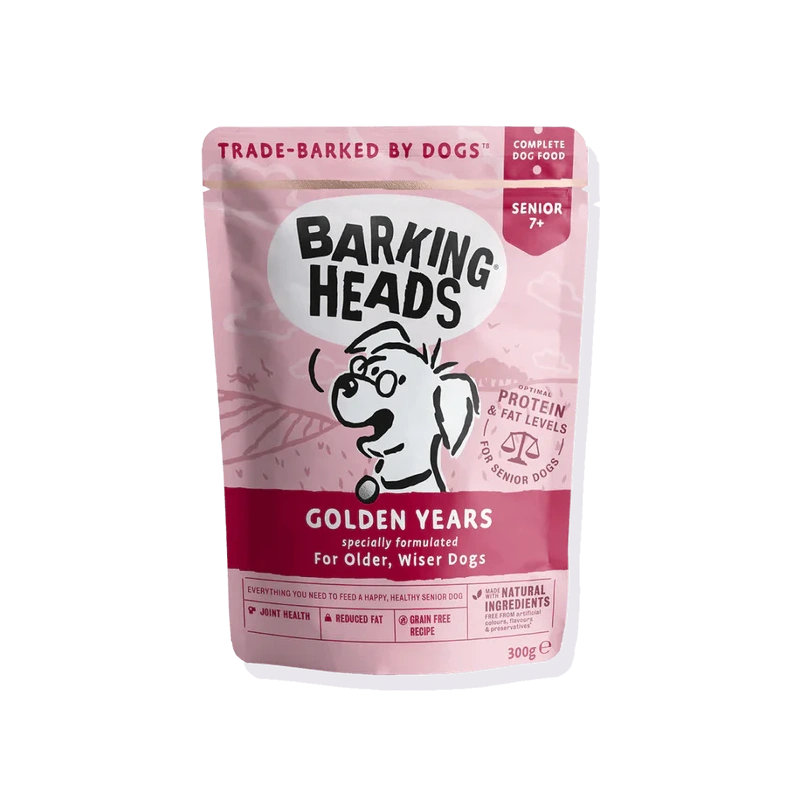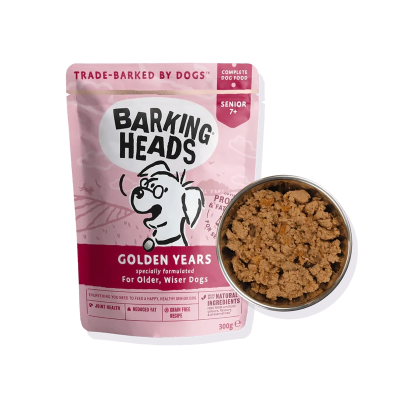 Barking Heads Golden Years Wet on spetsiaalselt välja töötatud teraviljavaba märgtoit vanematele koertele (7+ eluaastat). Retsept sisaldab kuni 85 % kanast ja lõhest, mida on aeglaselt küpsetatud koos tervislike köögiviljade ja ürtidega, et säilitada loomulik maitse ja toitained. Toit on rikastatud vitamiinide ja mineraalainetega ning toetab seedimist, liigeste tervist ja üldist heaolu ilma kunstlike värv-, maitse- või säilitusaineteta.