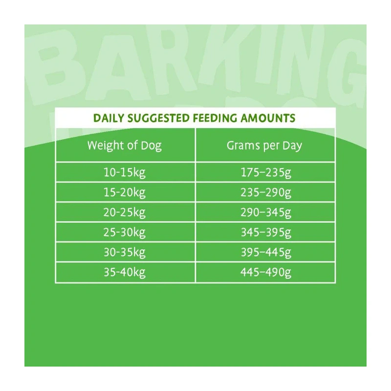 Soovituslik kogus sõltub koera aktiivsusest, temperamendist ja kehakaalust. Jaga päevane kogus vähemalt 2–3 söögikorraks päeva jooksul. Värske joogivesi peab alati olema kättesaadav.