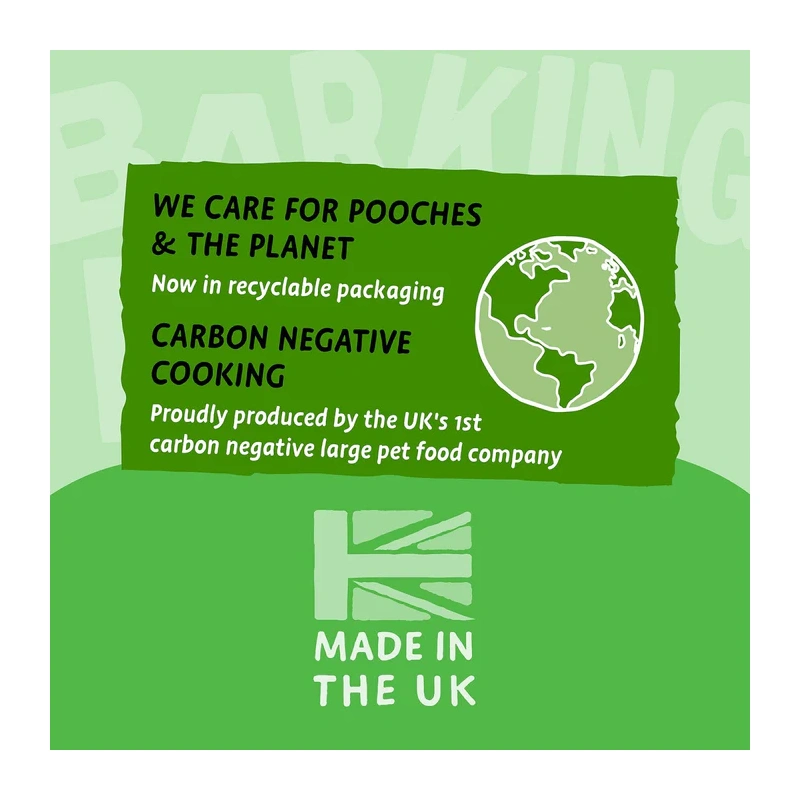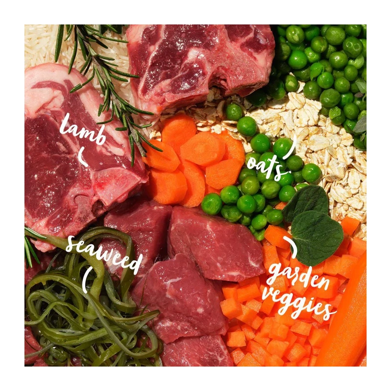 Koostis: Lambaliha 50 % (34 % värskelt valmistatud rohumaal kasvatatud lambaliha, 14 % kuivatatud lambaliha, 2 % lambakastet), Riis (26 %), Kaer, Herned (12 %), Linaseemned, Lõheõli (2 %), Mineraalid, Pärmtooted (1000 mg/kg), Sigurijuure ekstrakt (FOS 1000 mg/kg), Merevetikad, Kuivatatud porgand (500 mg/kg), Maitsetaimede segu (piparmünt, rosmariin, pune ja tüümian 500 mg/kg), Beetaglükaanid.