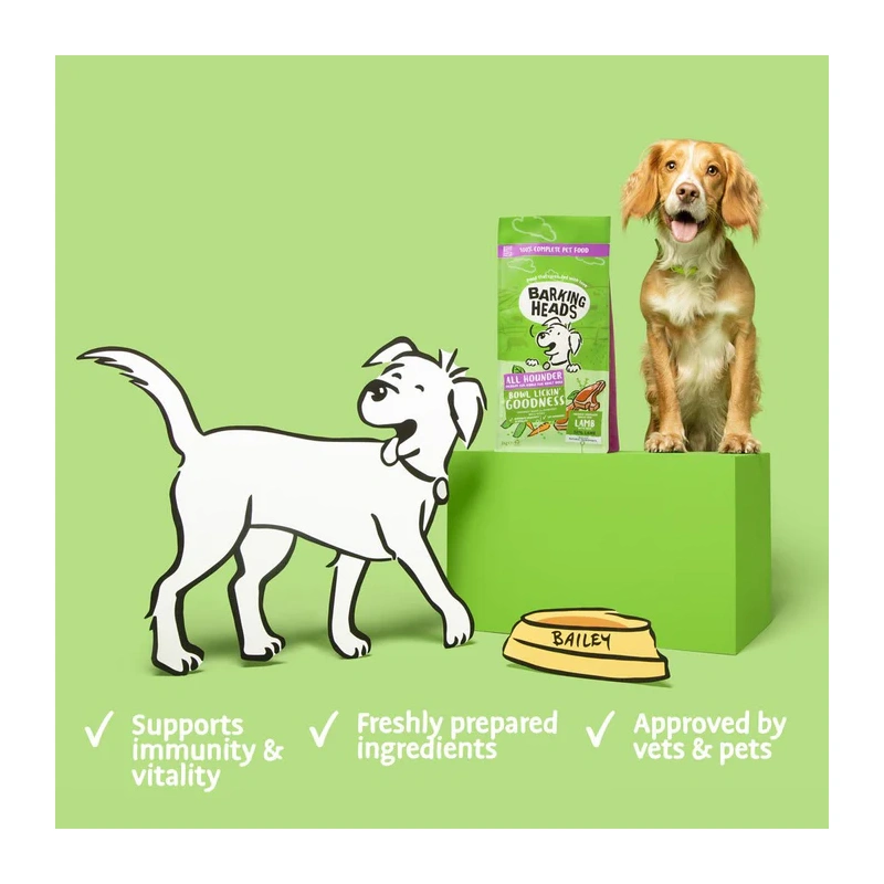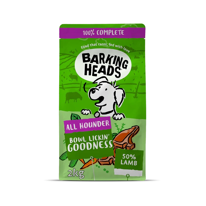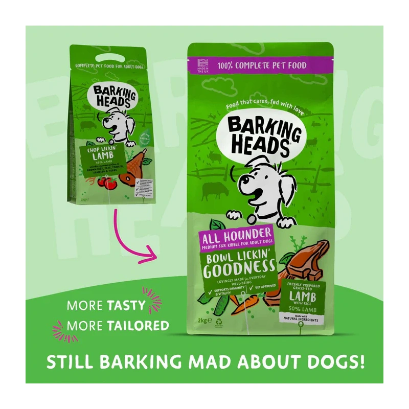 Barking Heads All Hounder Bowl Lickin’ Goodness Lamb on maitsev ja tasakaalustatud kuivtoit täiskasvanud koertele. See retsept sisaldab kuni 50 % rohumaal kasvatatud lambalihast (millest 34 % on värskelt valmistatud lambaliha), ning lisaks tervislikke teri, herneid, porgandeid ja ürte. Samuti on toidus loe-vabade süsivesikute energiaallikad ning looduslikud prebiootikumid, mis toetavad seeditavust. Lisatud on vitamiinid, mineraalid ning antioksüdandid, et aidata kaasa sinu koera immuunsüsteemi ja üldise tervise toetamisele. Toit ei sisalda täiteaineid ega kunstlikke lisaaineid.