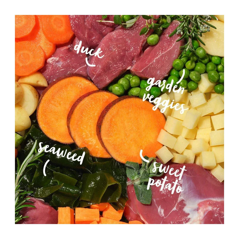 Koostis: 50 % pardiliha (27 % värskelt valmistatud vabapidamisel kasvatatud pardiliha, 19 % kuivatatud pardiliha, 2 % pardirasv, 2 % pardikaste), Maguskartul (24 %), Herned (12 %), Kartul, Lutsern, Linaseemned, Mineraalained, Pärmtooted (1000 mg/kg), Sigurijuure ekstrakt (FOS 1000 mg/kg), Merevetikad, Kuivatatud porgand (500 mg/kg), Segatud maitsetaimed (piparmünt, rosmariin, oregano ja tüümian 500 mg/kg), Beetaglükaanid.