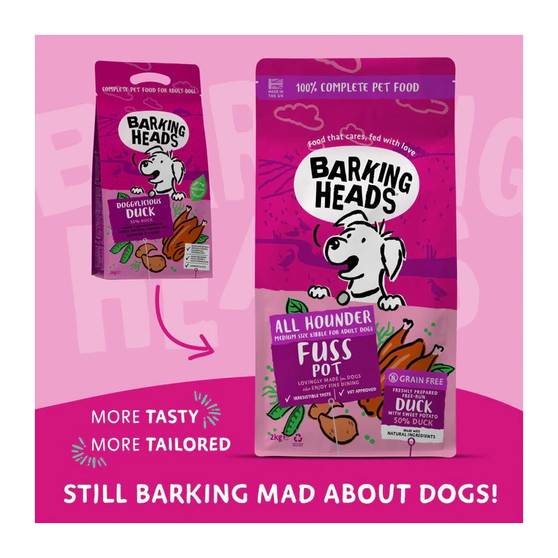 Barking Heads All Hounder Fuss Pot Duck on maitsev ja tasakaalustatud kuivtoit, mis on välja töötatud täiskasvanud koertele, kaasates tervislikud ja looduslikud koostisosad. Retsept on teraviljavaba, sisaldab vabapidamisel kasvatatud pardiliha ning aedvilju nagu maguskartul, herned ja porgand. See toit on loodud ka sensitiivsele seedimisele ning lisatud prebiootikumid ja vetikad toetavad seedimist ja toitainete imendumist. Retsept ei sisalda kunstlikke lisaaineid ega täiteaineid.