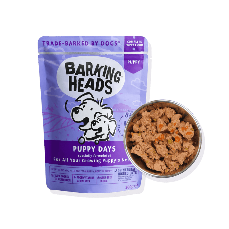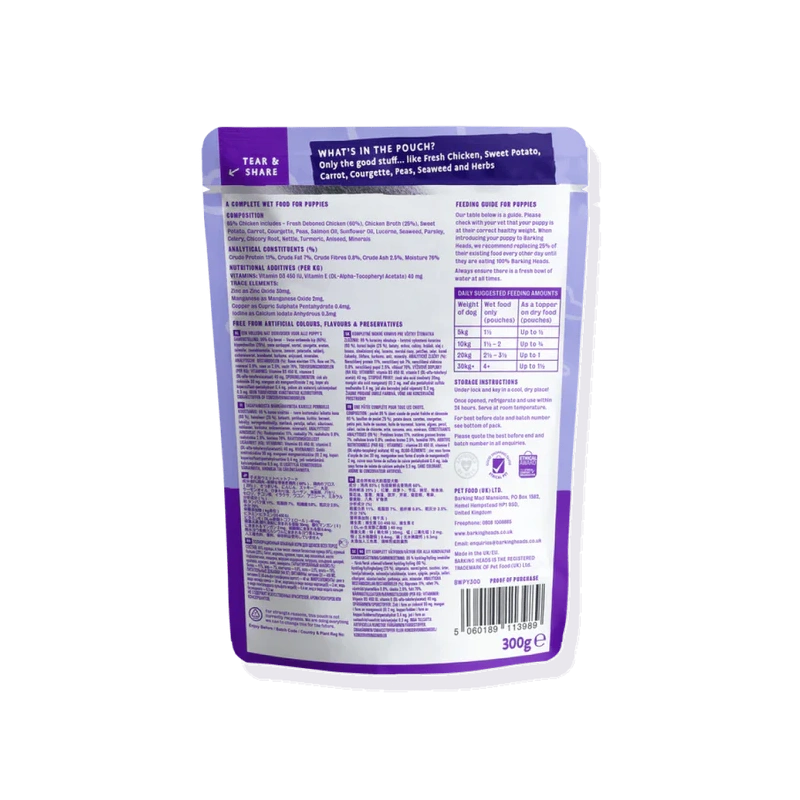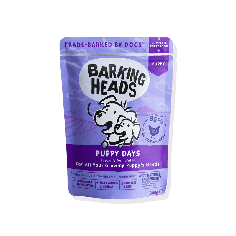 Barking Heads Puppy Days Wet on spetsiaalselt välja töötatud täisväärtuslik märgtoit kutsikatele. See teraviljavaba retsept sisaldab 85 % kvaliteetset vabapidamisel kasvatatud kana, mis on aeglaselt küpsetatud koos täisväärtuslike köögiviljade, ürtide ning lisatud vitamiinide ja mineraalainetega. See toit toetab sinu kutsika loomulikku arengut, immuunsüsteemi ja seedimist ning on rikastatud kõigi oluliste toitainetega, mida kasvav kutsikas vajab. Toit ei sisalda kunstlikke värvaineid, maitseaineid ega säilitusaineid ning sobib suurepäraselt täistoiduks või kuivtoidu lisandiks.