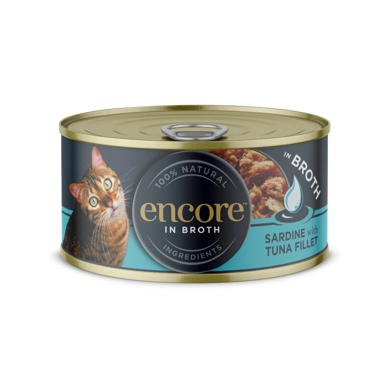 Encore tuunikala ja sardiiniga kassikonserv on kvaliteetne ja looduslik täiendtoit, mis sisaldab ehtsat kalaliha. Tuunikala ja sardiin on rikkad loomse valgu ning oomega-3 rasvhapete poolest, toetades kassi lihasmassi, naha tervist ja karvkatte läiget. Kergesti seeditav koostis sobib ka tundliku seedimisega kassidele. Toode ei sisalda kunstlikke värvaineid, säilitusaineid ega maitsevõimendeid.