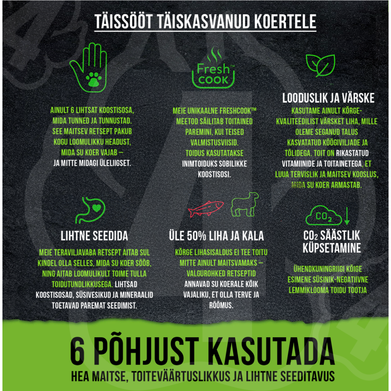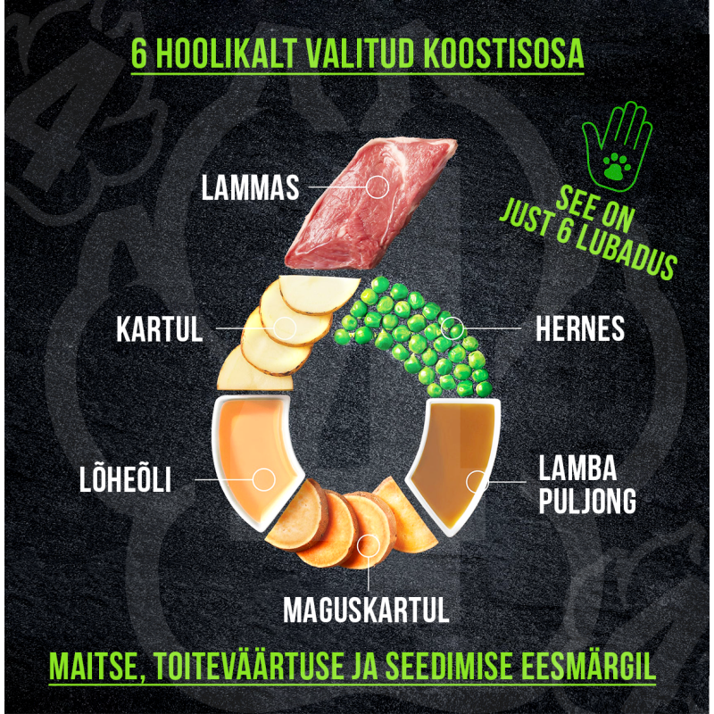 Harringtons Just6 koeratoit sisaldab vaid kuut põhikomponenti, pakkudes sinu koerale lihtsat ja toitvat täissööta. Toit on teraviljavaba ning sisaldab 50,5% liha (lambaliha ja lõhe). Lisatud lõheõli ja rapsiõli annavad oomega-3 ja oomega-6 rasvhappeid, mis toetavad naha ja karvkatte tervist.
