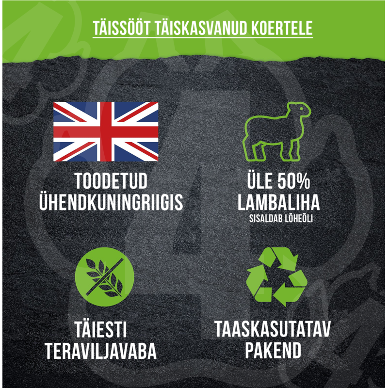 Lambaliha & lõhe 50,5% (sh värske lambaliha 22%, kuivatatud lambaliha 24%, lõheõli 3%, lambapuljong 1,5%), kartul 20%, maguskartul 17%, herned 11%, rapsiõli 1%, vitamiinid ja mineraalid.