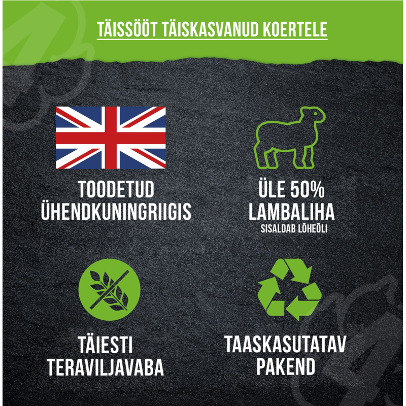 Lambaliha & lõhe 50,5% (sh värske lambaliha 22%, kuivatatud lambaliha 24%, lõheõli 3%, lambapuljong 1,5%), kartul 20%, maguskartul 17%, herned 11%, rapsiõli 1%, vitamiinid ja mineraalid.