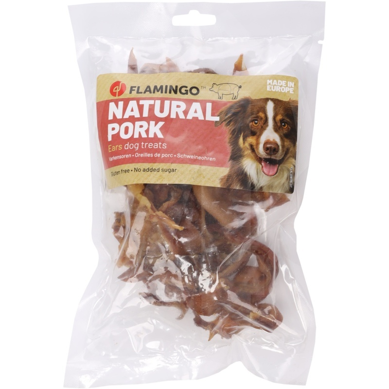 Flamingo seakõrvaribad on 100% naturaalsest sealihast valmistatud toitaineterikkad maiused koertele. Tegemist on täiesti loodusliku tootega, mis on gluteenivaba, suhkrut ei ole lisatud ning kunstlikke värv- ega säilitusaineid ei kasutata. See tagab koerale maitsva ja tervisliku närimiskogemuse. Maiused on toodetud Euroopas, järgides kõrgeid kvaliteedistandardeid. Kuna tegemist on loodusliku tootega, võivad suurus ja kaal varieeruda. Toode on mõeldud ainult koertele, mitte inimtoiduks, ning lemmikloomale peab alati olema tagatud värske joogivesi. Avatud pakendil on piiratud säilivusaeg.
