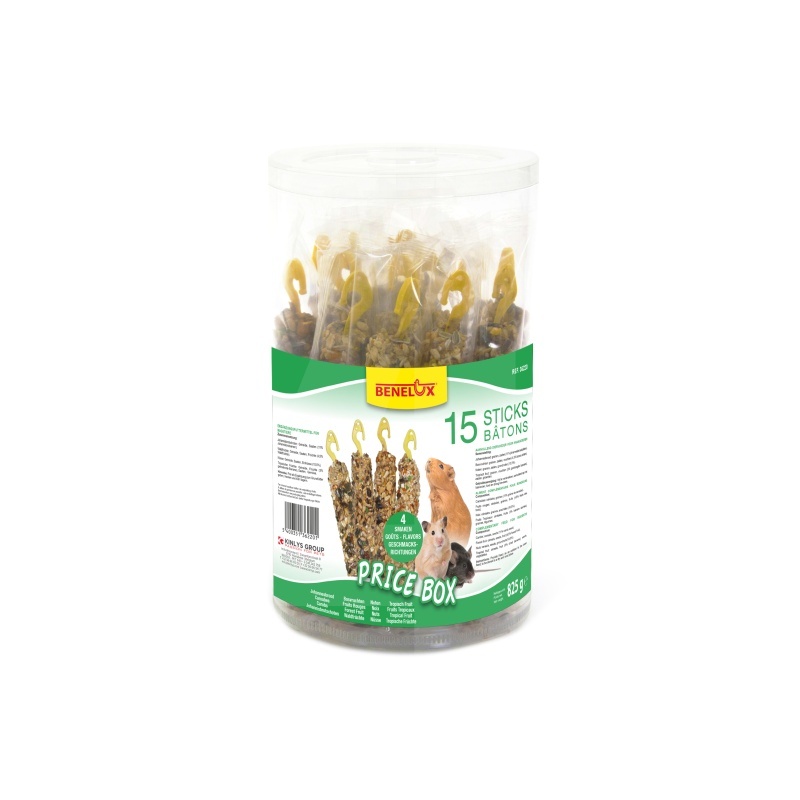 Benelux 15 maiusepulga komplekt pakub sinu väikeloomale maitsvat ja mitmekesist vaheldust. Igas pakis on esindatud neli erimaitselist pulka – jaanileivapuu, metsamarjad, pähklid ja troopilised puuviljad.
