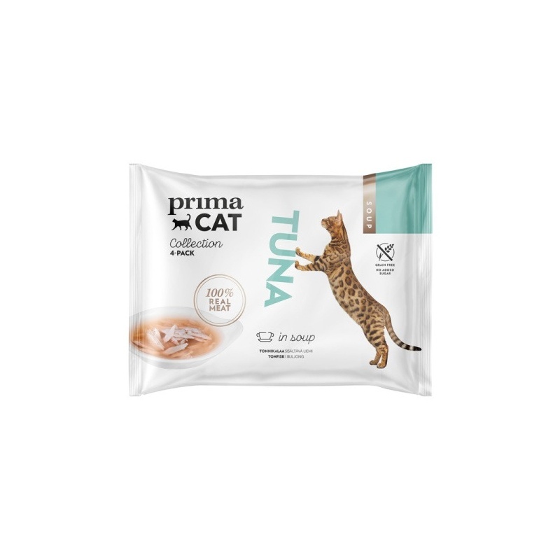 Kiisueine PrimaCat Soup ei sisalda teravilja, suhkrut, maisi, soja ega geenmuundatud koostisosi.