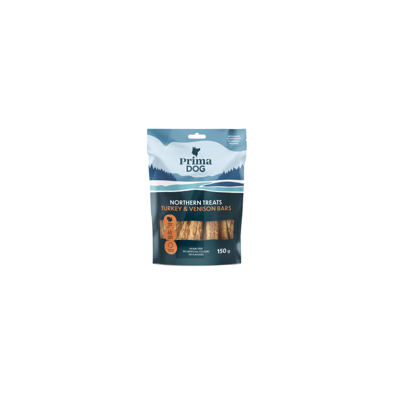 Maitsvad ja teraviljata kalkuni-hirvepulgad PrimaDog Northern Treats saavad oma meeldiva koostise ja isuäratava maitse esmaklassilistest koostisosadest, kuumast ahjust ning põhjamaisest väemarjast – mustsõstrast. See liharikas maius on põhjamaise tootearenduse tulemus ning valmib Eesti tehases.